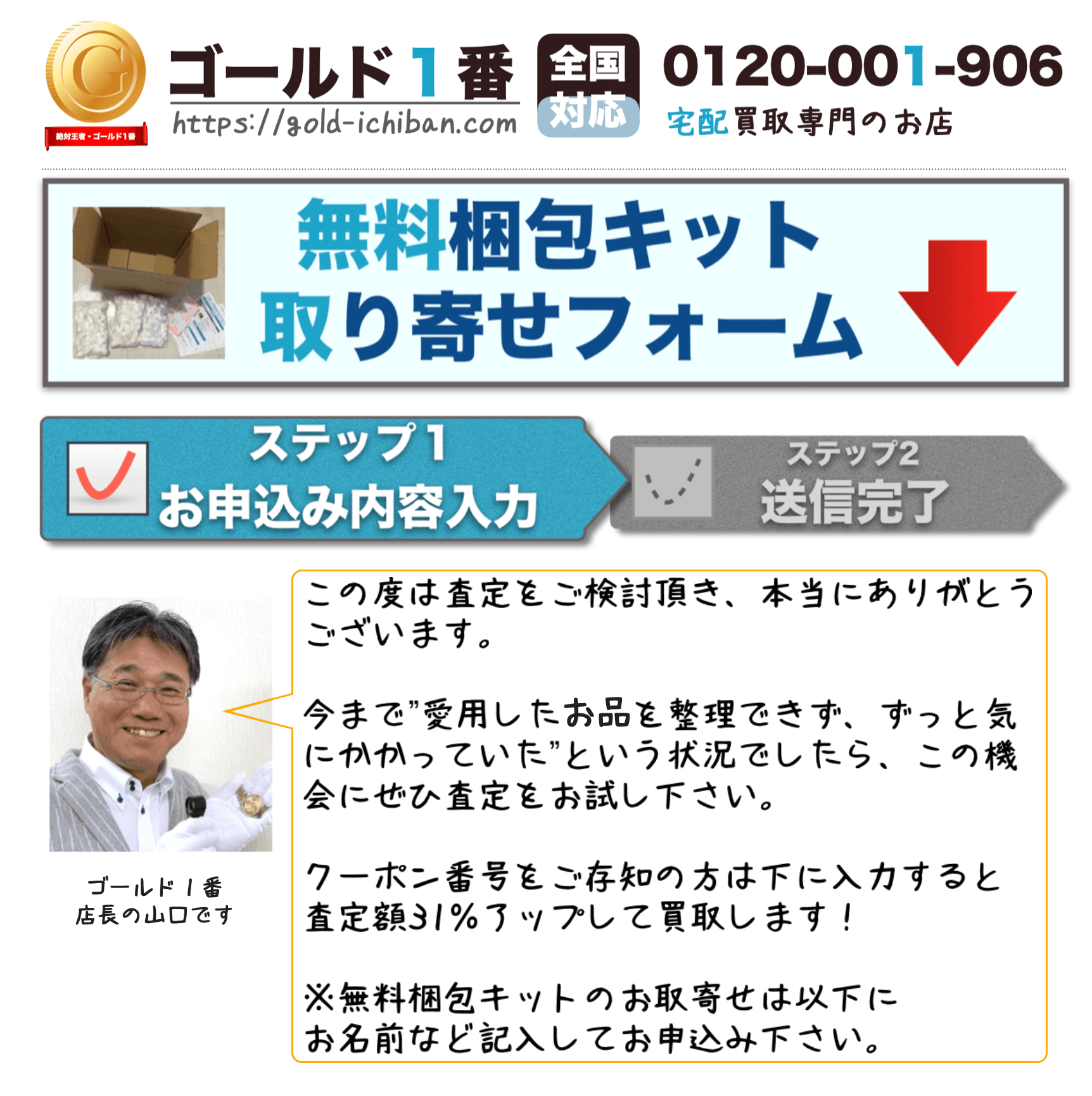 A:ダンボール箱と梱包用のプチプチ、買取依頼書、今後の流れの解説書、ヤマト着払い用送り状が入ったセットになります。